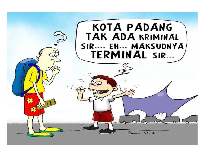 • Apakah tidak ada kebijakan tentang “tenda ceper” ? Lihat perwako padang tentang obyek wisata di danau cimpago s/d bina ria • Apakah tidak ada kebijakan tentang illegal logging dan pembalakan hutan ? Siapa yang mestinya bertanggung jawab ? • Apakah tidak ada terminal di kota padang ? Masalahnya digambar itu apakah terminal, kriminal, pariwisata atau mesjid raya ? • Ada TRB, ada TKL. . . Apa masalah terminal ? Kajian sosiologi perkotaan.