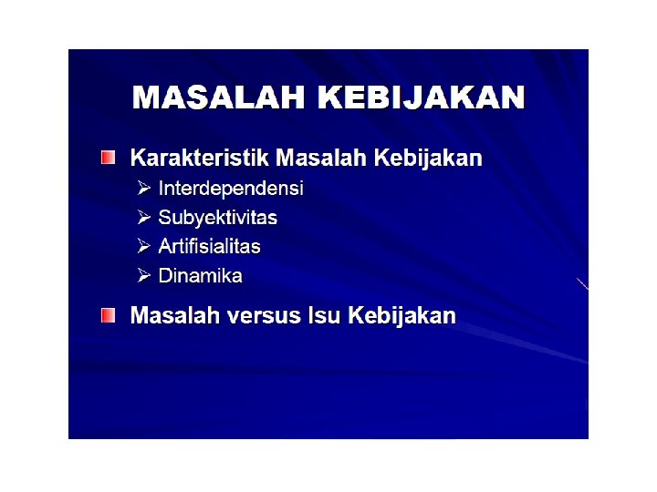 Beberapa Karakteristik Masalah Kebijakan (Muhadjir Darwin, 1993) : Menyangkut masyarakat luas Serius Potensial menjadi serius Ada peluang untuk memperbaiki