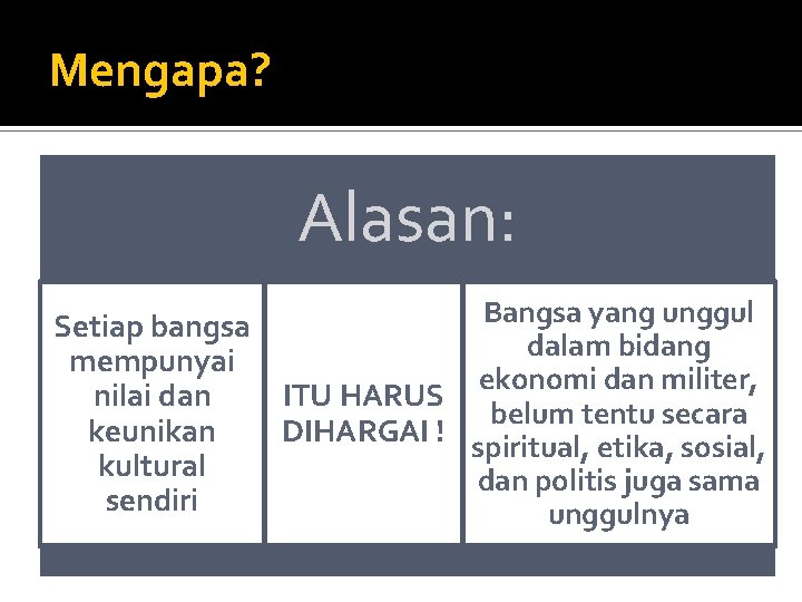 Mengapa? Alasan: Bangsa yang unggul Setiap bangsa dalam bidang mempunyai ekonomi dan militer, ITU HARUS nilai dan belum tentu secara DIHARGAI ! spiritual, etika, sosial, keunikan kultural dan politis juga sama sendiri unggulnya