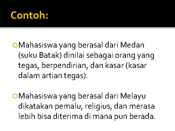 Contoh: Mahasiswa yang berasal dari Medan (suku Batak) dinilai sebagai orang yang tegas, berpendirian, dan kasar (kasar dalam artian tegas). Mahasiswa yang berasal dari Melayu dikatakan pemalu, religius, dan merasa lebih bisa diterima di mana pun berada.
