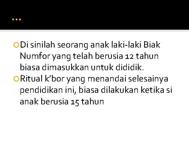… Di sinilah seorang anak laki-laki Biak Numfor yang telah berusia 12 tahun biasa dimasukkan untuk dididik. Ritual k’bor yang menandai selesainya pendidikan ini, biasa dilakukan ketika si anak berusia 15 tahun
