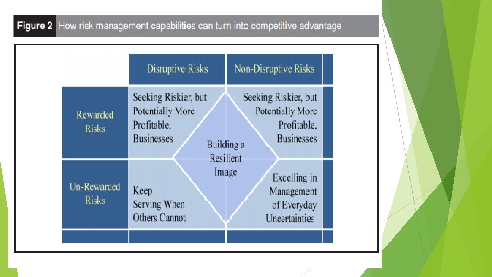 4 CARA MANAJEMEN RESIKO MENJADI KEUNGGULAN KOMPETITIF 1. Tetap melayani ketika yang lain berhenti - Kompromi dengan resiko yang mengganggu dan resiko yang tidak bernilai. Contoh : Kasus Nokia vs Ericson. Nokia mampu meningkatkan pangsa pasar 30% dari 27% ketika Ericson turun dari 12% menjadi 9%. Nokia responsif ketika pemasok Royal Philip Electric mengalami kebakaran untuk mencari pemasok lain dalam memenuhi komponen yang dibutuhkan