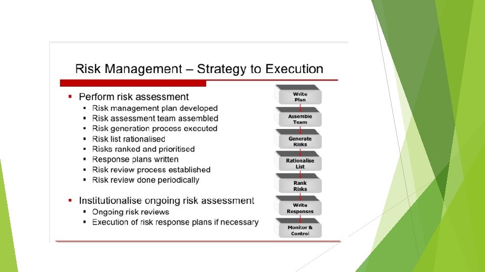 PROJECT – OPPORTUNITY/RISKS OPPORTUNITY § § § § Identification gaps in realization of strategic objective Escalates current risks & identifies potential risks earlier Ensures proper communications to relevant stakeholder Improves monitoring and control of project Mediates issue resolution Increases efficiency in tracking progress of projects Integrates project plans for all projects – standardizes progress reporting RISKS • • Fragmentend project plans Poorly defined project mission & tasks No clear process for escaping risksto senior management decisions Insufficient reporting to support top-management decisions Ineffective enforcement of project controls and policies Conflict between line and project managers Projects do not meet deadlines and/or milestones Lack of standardized reports and reporting frameworks