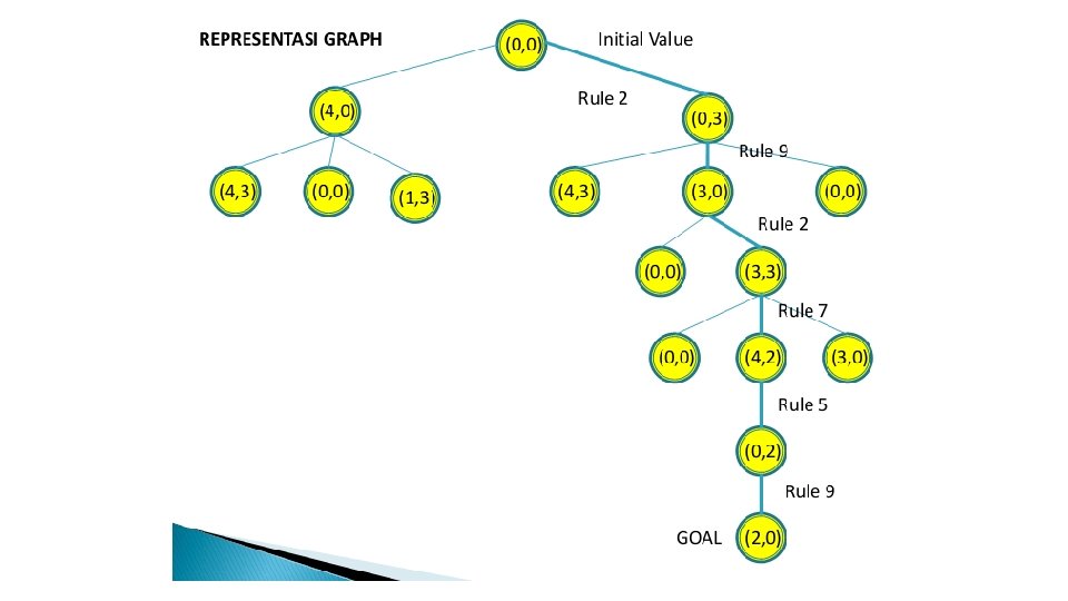 • Ruang masalah untuk masalah di atas dapat digambarkan sebagai himpunan pasangan bilangan bulat (x, y) yang terurut, sedemikian hingga : – x = 0, 1, 2, 3, atau 4 – y = 0, 1, 2, atau 3; • x menyatakan jumlah air dalam gelas ukuran 4 galon, dan y menyatakan jumlah air dalam gelas ukuran 3 galon. Dengan keadaan mula-mula adalah (0, 0). • State tujuan adalah (2, n) untuk setiap nilai n.