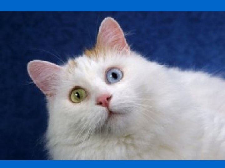 Van Kedisi n Görünüş ve Vücut Yapısı • Uzun olmayan orta büyüklükte bir başı olan Van kedilerinin yüzü üçgen şeklinde ve çevresi belirlenmiştir. Elmacık kemikleri de çıkıktır. Boynu güçlü ve kısadır. Gözler hafif şekilde basık badem şeklinde ve eğik olarak yüze yerleşmiştir. Göz bebekleri yuvarlak ve belirgindir. Van kedisini çekici kılan özelliklerden birisi de onun gözlerinin rengidir. Her iki gözü mavi, kehribar sarı renk ve tonlarında olabileceği gibi bir gözü mavi diğer gözü kehribar renkte de olabilir.