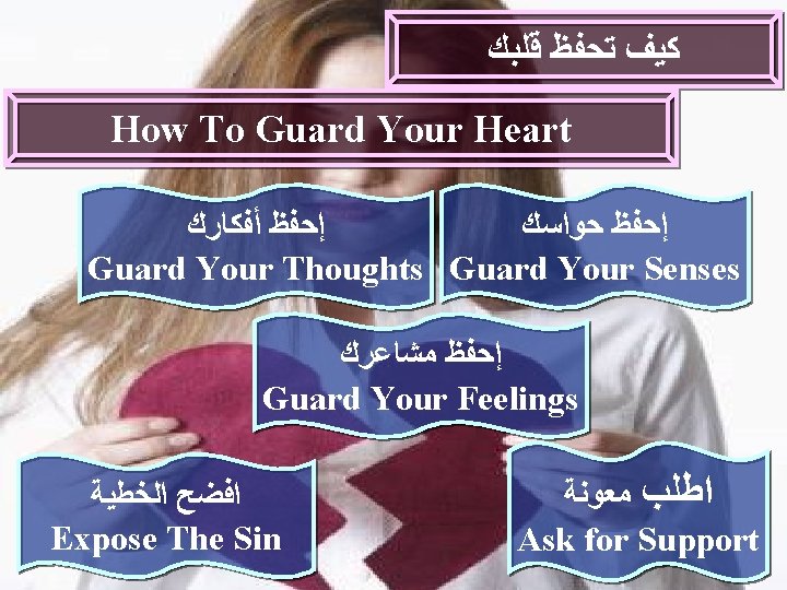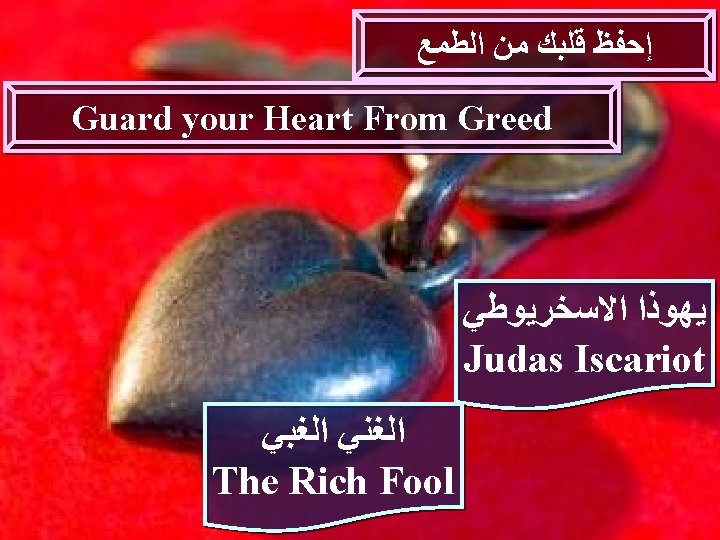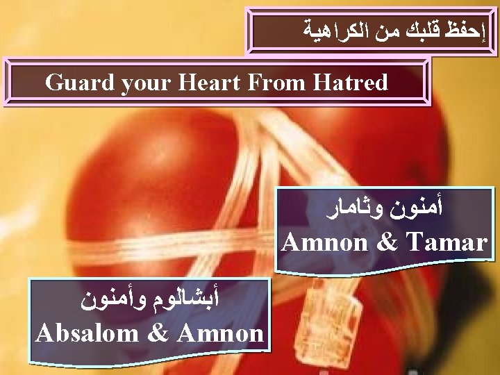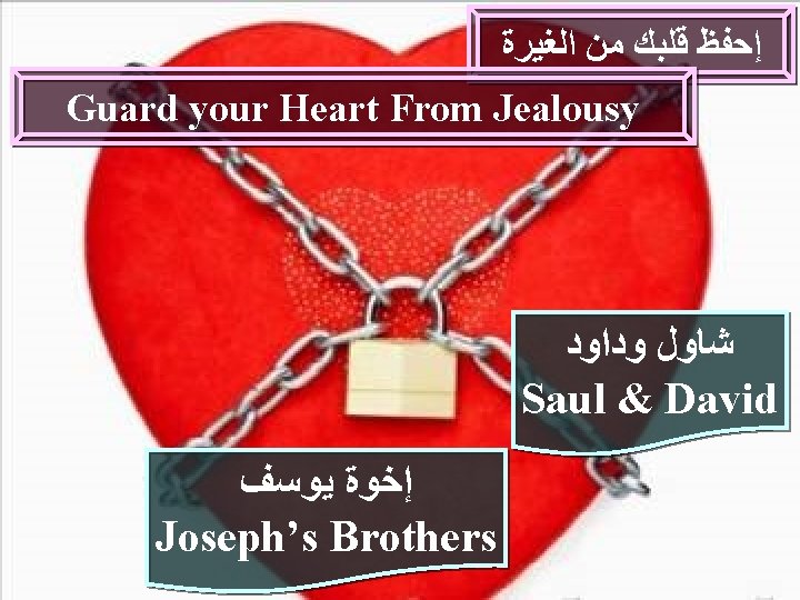 ﻗﻮﺗﻚ ﻛﻞ ﻣﻦ ﻭ ﻧﻔﺴﻚ ﻛﻞ ﻣﻦ ﻭ ﻗﻠﺒﻚ ﻛﻞ ﻣﻦ ﺍﻟﻬﻚ ﺍﻟﺮﺏ ﻓﺘﺤﺐ (5 : 6 )ﺗﺚ You shall love the LORD your God with all your heart, with all your soul, and with all your strength. (Deut 6: 5) (9 : 17 ﻳﻌﺮﻓﻪ )ﺍﺭ ﻣﻦ ﻧﺠﻴﺲ ﻫﻮ ﻭ ﺷﻴﺀ ﻛﻞ ﻣﻦ ﺍﺧﺪﻉ ﺍﻟﻘﻠﺐ The heart is deceitful above all things, And desperately wicked; Who can know it? (Jer 17: 9)