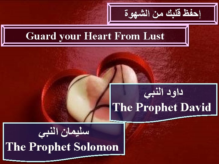 (23 : 4 ﺍﻟﺤﻴﺎﺓ )ﺍﻡ ﻣﺨﺎﺭﺝ ﻣﻨﻪ ﻻﻥ ﻗﻠﺒﻚ ﺍﺣﻔﻆ ﺗﺤﻔﻆ ﻛﻞ ﻓﻮﻕ Keep your heart with all diligence, For out of it spring the issues of life. ( Prov 4: 23) (26 : 23 ﻃﺮﻗﻲ )ﺍﻡ ﻋﻴﻨﺎﻙ ﻟﺘﻼﺣﻆ ﻭ ﻗﻠﺒﻚ ﺍﻋﻄﻨﻲ ﺍﺑﻨﻲ ﻳﺎ My son, give me your heart, And let your eyes observe my ways. ( Prov. 23: 26)