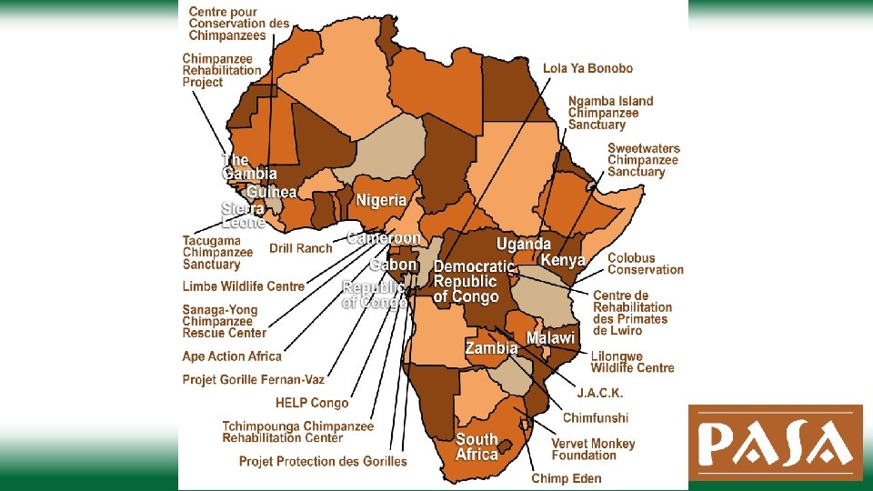 What is a PASA Sanctuary? • Definition of PASA member sanctuaries: • “A PASA member sanctuary provides a safe and secure home for African primates in need. The welfare of the individuals and the preservation of the species are of prime importance. The sanctuary uses an integrated approach to conservation, which can include rehabilitation and reintroduction. ”