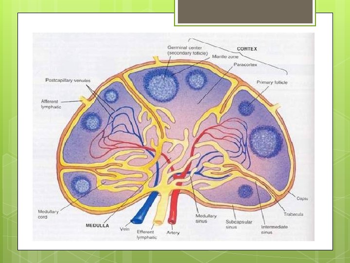Sebuah kelenjar terdiri dari jaringan fibrous, jaringan otot, dan jaringan kelenjar. Di sebelah luar, jaringan limfa terbungkus oleh kapsul fibrous. Dari sini keluar tajuk-tajuk dari jaringan otot dan fibrous, yaitu trabekulae, masuk ke dalam kelenjar dan membentuk sekat. Ruangan di antaranya berisi jaringan kelenjar yang mengandung banyak sel darah putih atau limfosit.