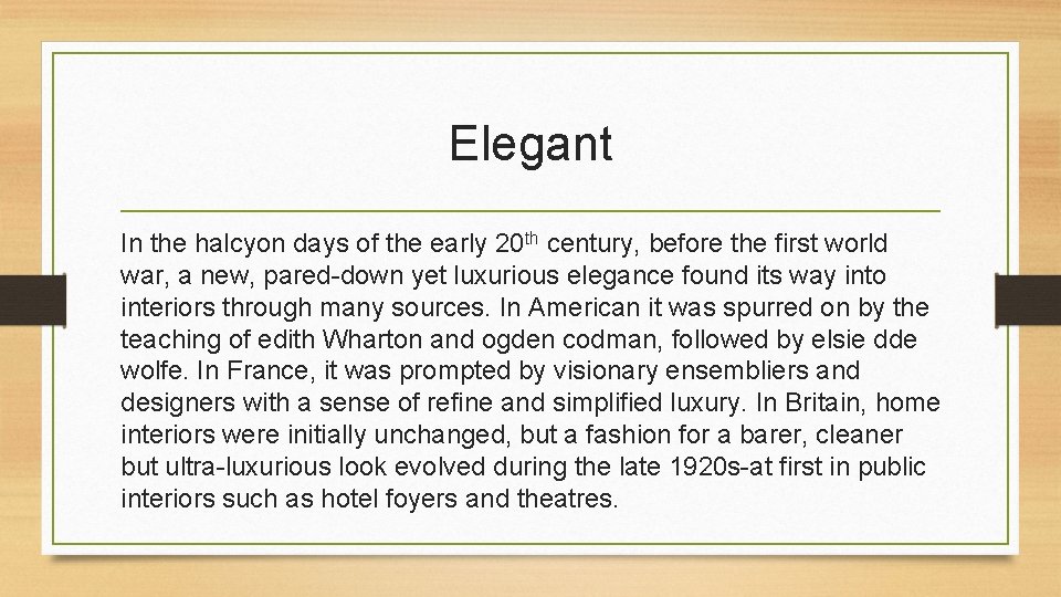 Elegant In the halcyon days of the early 20 th century, before the first world war, a new, pared-down yet luxurious elegance found its way into interiors through many sources. In American it was spurred on by the teaching of edith Wharton and ogden codman, followed by elsie dde wolfe. In France, it was prompted by visionary ensembliers and designers with a sense of refine and simplified luxury. In Britain, home interiors were initially unchanged, but a fashion for a barer, cleaner but ultra-luxurious look evolved during the late 1920 s-at first in public interiors such as hotel foyers and theatres.