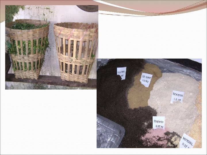 Kandungan nutrisi dari beberapa jenis pakan: 1. Bekatul Kasar Kandungan Bekatul kasar ( kulit gabah yang bercampur dengan pecahan padi ) ; protein 13, 2 – 27, 3 %, lemak 17 – 22, 9% , serat 9, 5 – 13, 2 %, Abu 9, 2 – 11, 5%, N bebas 39, 6 – 60, 8%, Pati 16, 1%, Gula 6, 4 – 6, 5 % dan juga Vit B Kompleks ( B 1, B 2, B 3, B 5, B 6 dan B 15 ) 2. Ampas Tahu Protein 23, 55%, lemak 5, 54%, karbohidart 26, 92%, abu 17, 03%, serat kasar 16, 53% , air 10, 43%. 3. Wortel Kandungan yang ada pada wortel yaitu : vitamin A yang sangat tinggi sebesar 12. 000 SI, kalori 42 kal, protein 1, 2 gram, lemak 0, 3 gram, hidrat arang 9, 3 gram, kalsium 39 miligram, fosfor 37 miligram, besi 0, 8