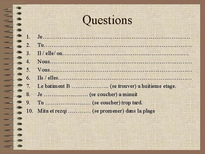 cle 1. Je me lave 2. Tu te leves 3. On se reveille 4. Nous nous levons 5. Vous vous reveillez 6. Ils/ elles se couchent 7. Se trouve 8. Me couche 9. Tu couches 10. Se promenent