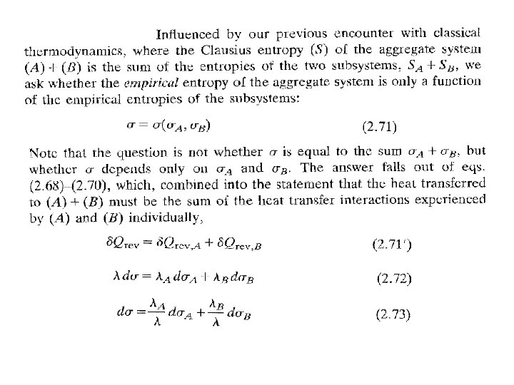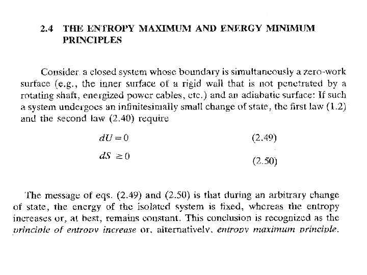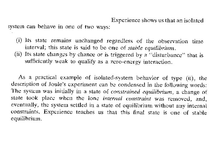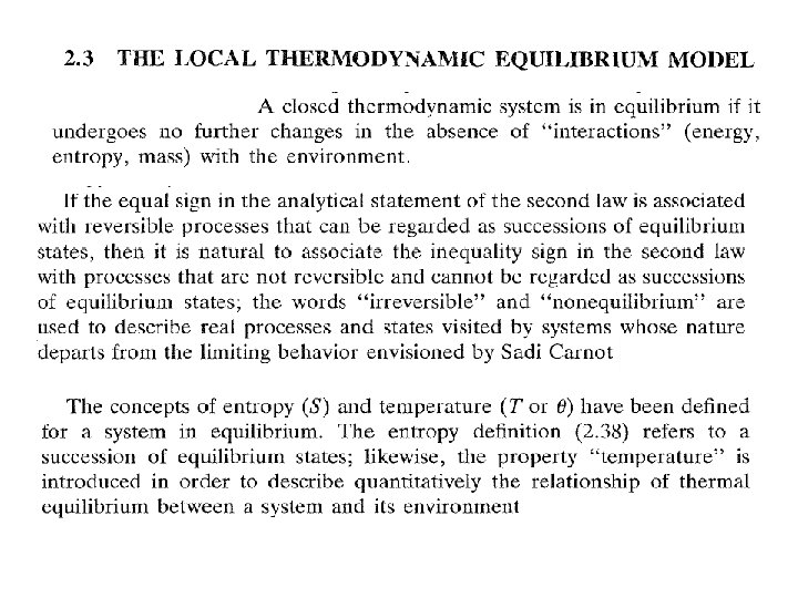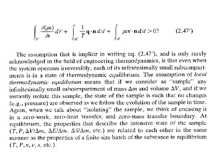 Nadie, absolutamente nadie, ha logrado extender la definición termodinámica de entropía para sistemas que se encuentran en estados fuera de equilibrio, excepto en lo que se conoce como equilibrio local y, en este caso, no es más que el concepto de equilibrio global extrapolado para regir en pequeños subsistemas que componen al sistema total. Para comprender esto imagine un sistema caracterizado por N partículas, ocupando un volumen V y con una energía total E. Mentalmente subdividamos el volumen V en celdas pequeñas, sin importar el número de ellas, de manera que el número de partículas que ocupa cada celda sea mucho menor que N pero suficientemente grande como para poder considerar a la población de cada celda insensible al comportamiento de unas cuantas de ellas. Ahora pensemos en que el sistema grande no está en equilibrio, esto es, que sus propiedades cambian con el transcurso del tiempo. Por otra parte supongamos que en cada celda, el número de partículas, la energía de ellas en la celda y otras propiedades, guardan entre sí la misma relación que guardan la energía total E, el volumen total V y el número total de partículas N cuando el sistema está en equilibrio. A esta hipótesis, muy útil en el desarrollo de la llamada termodinámica de procesos irreversibles, se le llama la hipótesis de equililibrio local. De acuerdo con esta hipótesis, en cada celda en que hemos subdividido al sistema, la entropía será la misma función del volumen y la energía de la celda que la entropía total lo es de E y V. Es claro que en cada celda de nuestro sistema la entropía local será la misma función del volumen y la energía de la celda en equilibrio. Y en la práctica, de poco ha servido para usar la entropía como un criterio de irreversibilidad.