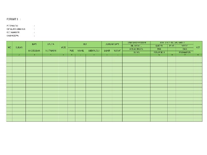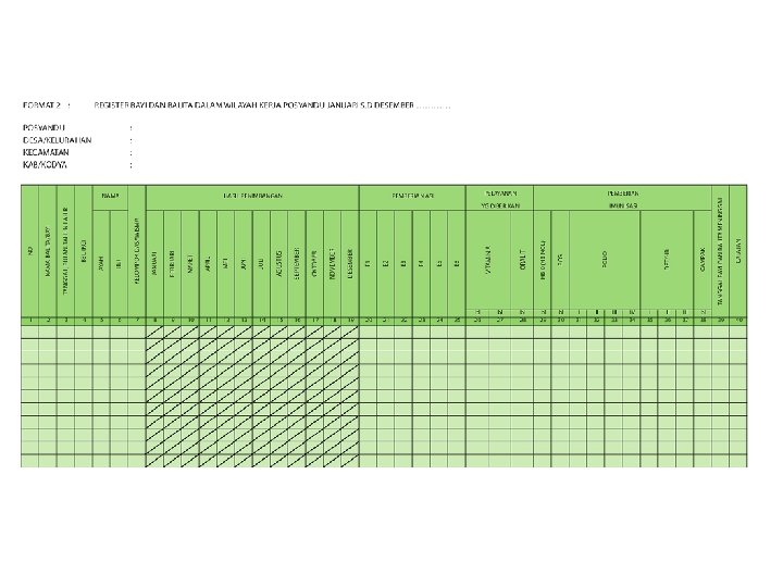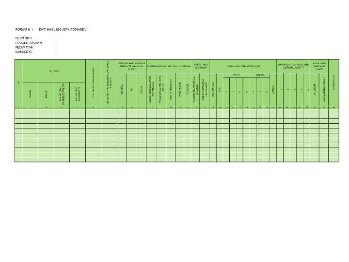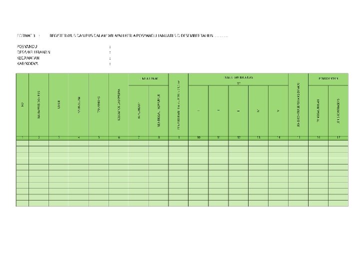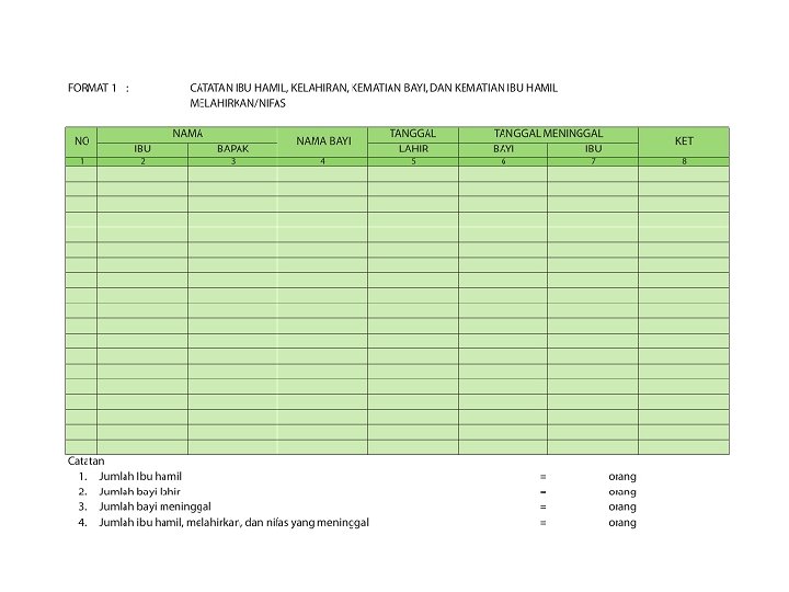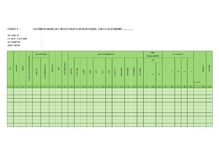 Format SIP (2) Format 4: Register Ibu Hamil dan Nifas Daftar wanita dan suami istri usia produktif yang memiliki kemungkinan mempunyai anak (hamil). Format 5: Data Posyandu Berisi catatan jumlah pengunjung (bayi, balita, WUS, PUS, ibu hamil, menyusui, bayi lahir dan meninggal), jumlah petugas yang hadir (kader Posyandu, kader PKK, PKB/PLKB, paramedis dan sebagainya). Format 6: Data hasil kegiatan Posyandu Catatan jumlah ibu hamil yang diperiksa dan mendapat tablet tambah darah, jumlah ibu menyusui, peserta KB ulang yang dilayani, penimbangan balita, semua balita yang mempunyai KMS (K), balita yang timbangannya naik dan yang di Bawah Garis Merah (BGM), balita yang mendapatkan Vitamin A, KMS yang dikeluarkan (dibagikan), balita yang mendapat sirup besi, dan imunisasi (DPT, polio, campak, hepatitis B) serta balita yang menderita diare.