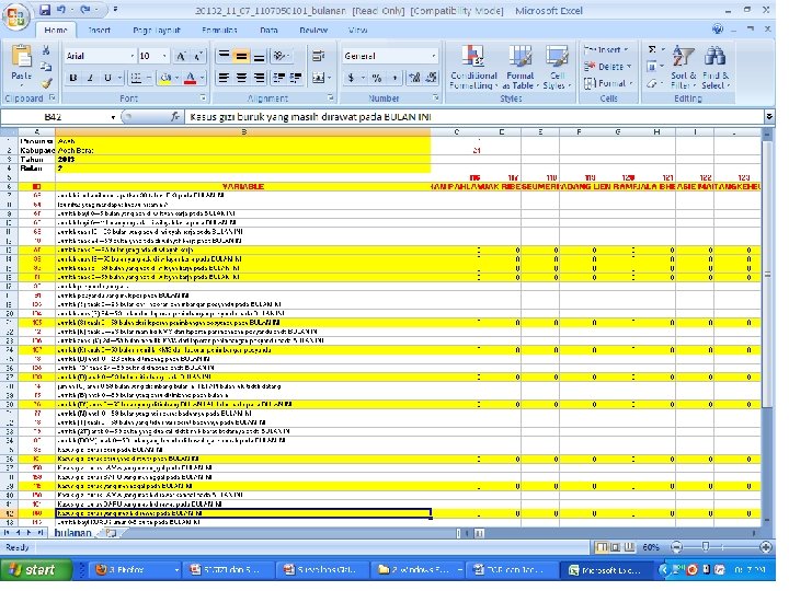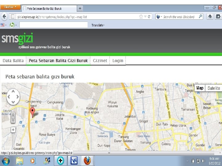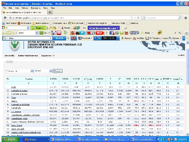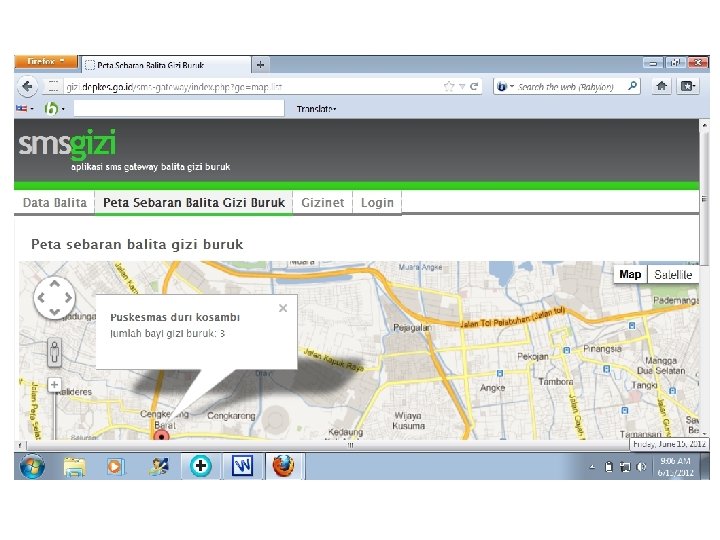 Indikator Kinerja: 1. 85% balita yang ditimbang berat badannya (D/S) 2. 100% gizi buruk yang mendapat perawatan Indikator Penunjang: 3. 80% bayi 0 -6 bulan yang mendapat ASI eksklusif 4. 90% rumah tangga mengonsumsi garam beriodium 5. 85% balita usia 6 -59 bulan mendapat kapsul vitamin A 6. 90% ibu hamil yang mendapat 90 tablet besi 7. 100% kabupaten/kota yang melaksanakan surveilans gizi 8. 100% penyediaan buffer stock MP-ASI untuk daerah bencana Ø Indikator kinerja Kemkes Ø Inpres 3/2010: dilaporkan ke UKP 4 (2012: B 04, B 06, B 09, B 12) kinerja Kemkes ≈ kinerja Menkes Diperlukan penyajian data dan informasi indikator kinerja yang cepat, akurat dan berkelanjutan