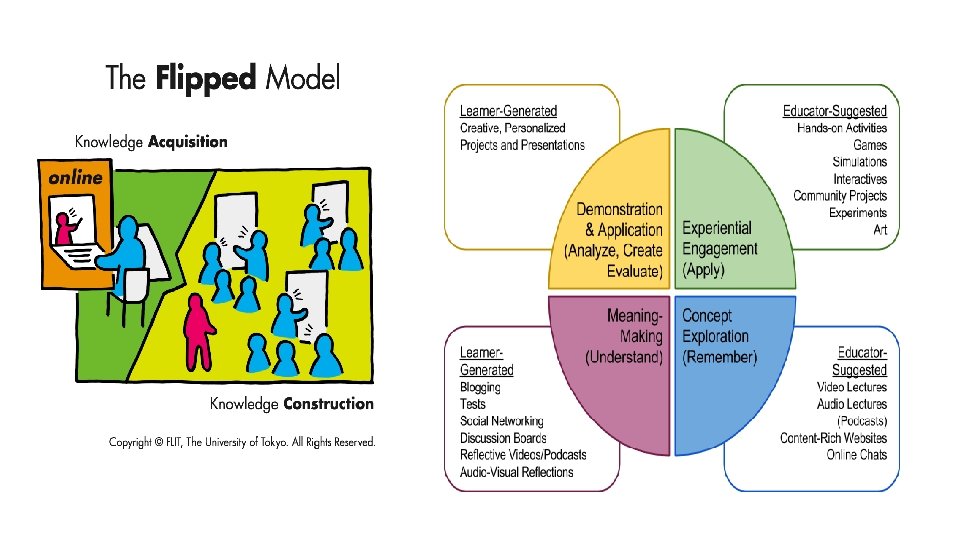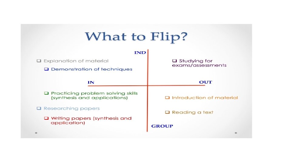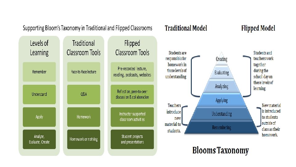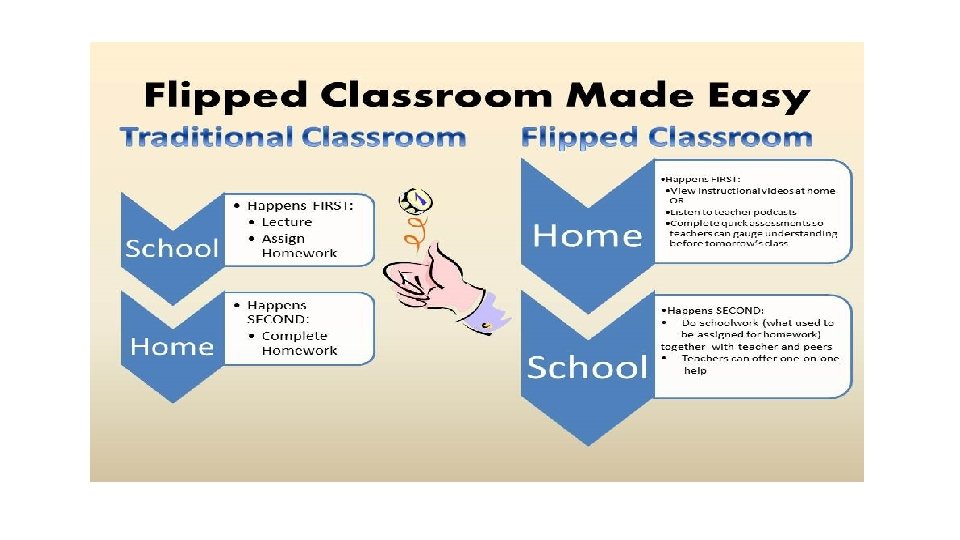 4. FLIPPED LEARNING What is the 'Flipped Classroom'? Flipped Classroom is an instructional strategy and a type of blended learning that reverses the traditional learning environment by delivering instructional content, often online, outside of the classroom. It moves activities, including those that may have traditionally been considered homework, into the classroom. The flipped classroom describes a reversal of traditional teaching where students gain first exposure to new material outside of class, usually via reading or lecture videos, and then class time is used to do the harder work of assimilating that knowledge through strategies such as problem-solving, discussion or debates. (Vanderbilt University, Center for Teaching).