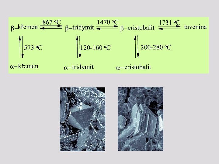 Kyslíkaté sloučeniny křemíku – oxidy Oxidu křemnatý Si. O vzniká za vysokých teplot, není stálý a snadno se oxiduje (na vzduchu hoří) na oxid křemičitý. Oxid křemičitý Si. O 2 v Svými vlastnostmi diametrálně liší od CO 2. v Atom křemíku má hybridizaci sp 3, je tedy ve středu tetraedru, jehož vrcholy tvoří můstkové kyslíkové atomy. v Struktura Si. O 2 je tedy makromolekulární (každý krystal představuje jedinou molekulu), při čemž tetraedry Si. O 4 jsou vzájemně propojeny svými vrcholy. v Dva sousední tetraedry mají společný vždy jen jeden kyslíkový atom. v Uspořádání tetraedrů Si. O 4 umožňuje existenci tří krystalových modifikací oxidu křemičitého: křemen, tridymit a cristobalit. v Každá z těchto modifikací může existovat ve dvou formách, nízkoteplotní α a vysokoteplotní β, které zachovávají typ vzájemného spojování tetraedrů v prostoru, liší se malými rozdíly v geometrickém umístění tetraedrů.
