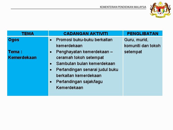 TEMA Ogos Tema : Kemerdekaan CADANGAN AKTIVITI Promosi buku-buku berkaitan kemerdekaan Penghayatan kemerdekaan – ceramah tokoh setempat Sambutan bulan kemerdekaan Pertandingan senarai judul buku berkaitan kemerdekaan Pertandingan sajak/lagu Kemerdekaan PENGLIBATAN Guru, murid, komuniti dan tokoh setempat