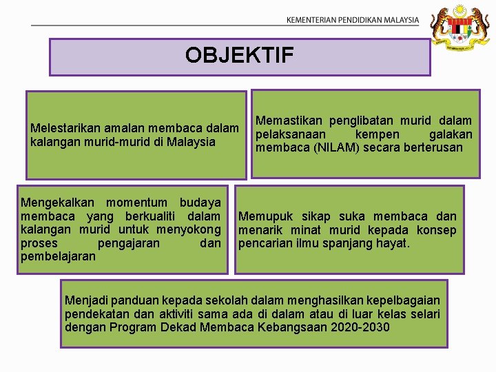 OBJEKTIF Melestarikan amalan membaca dalam kalangan murid-murid di Malaysia Mengekalkan momentum budaya membaca yang berkualiti dalam kalangan murid untuk menyokong proses pengajaran dan pembelajaran Memastikan penglibatan murid dalam pelaksanaan kempen galakan membaca (NILAM) secara berterusan Memupuk sikap suka membaca dan menarik minat murid kepada konsep pencarian ilmu spanjang hayat. Menjadi panduan kepada sekolah dalam menghasilkan kepelbagaian pendekatan dan aktiviti sama ada di dalam atau di luar kelas selari dengan Program Dekad Membaca Kebangsaan 2020 -2030