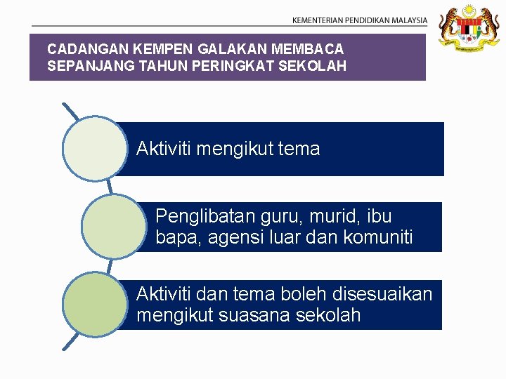 CADANGAN KEMPEN GALAKAN MEMBACA SEPANJANG TAHUN PERINGKAT SEKOLAH Aktiviti mengikut tema Penglibatan guru, murid, ibu bapa, agensi luar dan komuniti Aktiviti dan tema boleh disesuaikan mengikut suasana sekolah
