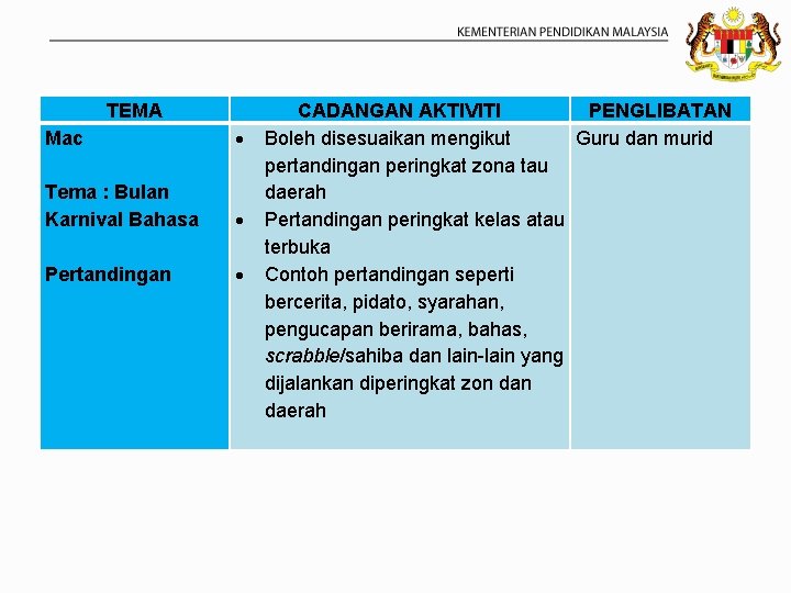 TEMA Mac Tema : Bulan Karnival Bahasa Pertandingan CADANGAN AKTIVITI PENGLIBATAN Boleh disesuaikan mengikut Guru dan murid pertandingan peringkat zona tau daerah Pertandingan peringkat kelas atau terbuka Contoh pertandingan seperti bercerita, pidato, syarahan, pengucapan berirama, bahas, scrabble/sahiba dan lain-lain yang dijalankan diperingkat zon daerah
