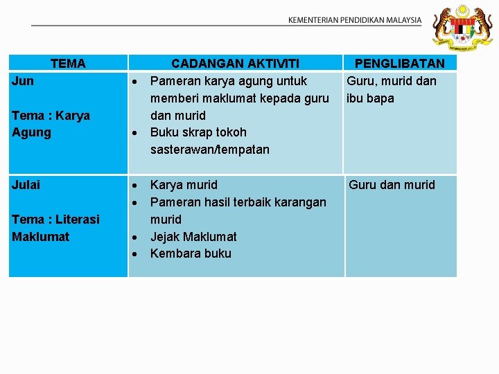 TEMA Jun Tema : Karya Agung CADANGAN AKTIVITI Pameran karya agung untuk memberi maklumat kepada guru dan murid Buku skrap tokoh sasterawan/tempatan PENGLIBATAN Guru, murid dan ibu bapa Karya murid Pameran hasil terbaik karangan murid Jejak Maklumat Kembara buku Guru dan murid Julai Tema : Literasi Maklumat