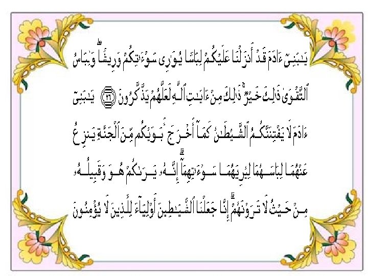 Wahai anak-anak Adam! Janganlah kamu diperdayakan oleh Syaitan sebagaimana ia telah mengeluarkan kedua ibu bapa kamu dari Syurga, sambil ia menyebabkan terlucutnya pakaian mereka berdua untuk memperlihatkan kepada mereka: aurat mereka (yang sebelum itu tertutup). Sesungguhnya Syaitan dan kaumnya melihat kamu dengan keadaan yang kamu tidak dapat melihat mereka. Sesungguhnya Kami telah menjadikan Syaitan-syaitan itu teman rapat bagi orang-orang yang tidak beriman. AL-A’RAF 27