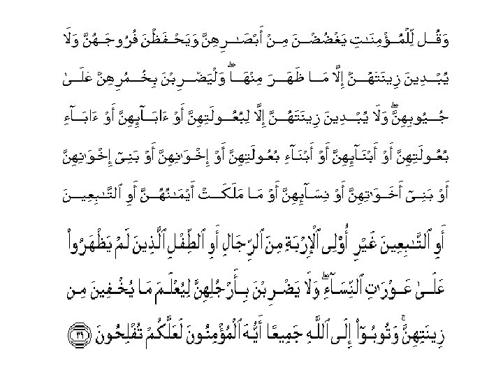 Dan katakanlah kepada perempuan-perempuan yang beriman supaya menyekat pandangan mereka (daripada memandang yang haram), dan memelihara kehormatan mereka; dan janganlah mereka memperlihatkan perhiasan tubuh mereka kecuali yang zahir daripadanya; dan hendaklah mereka menutup belahan leher bajunya dengan tudung kepala mereka; dan janganlah mereka memperlihatkan perhiasan tubuh mereka melainkan kepada suami mereka, atau bapa mereka atau bapa mertua mereka atau anak-anak mereka, atau anak-anak tiri mereka, atau saudara-saudara mereka, atau anak bagi