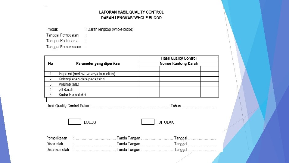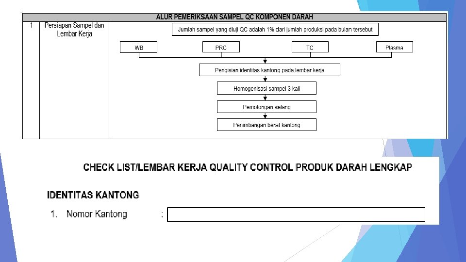 Jumlah sampel minimal setiap produk darah untuk quality control adalah 1% dari jumlah produksi di bulan tersebut atau sekurang-kurangnya 4 kantong darah. Produk Darah Jumlah Produksi Bulan X 1% Sampel WB 218 2, 18 PRC 789 7, 89 TC 112 1, 12 = 218 x 1%= 218 x = 2, 18 Jumlah Sampel yang digunakan 4 8 4