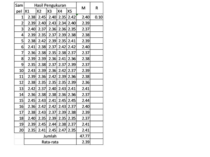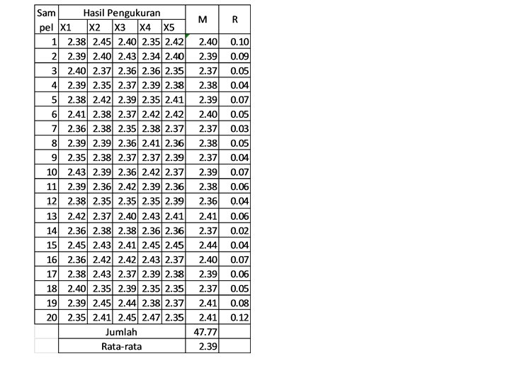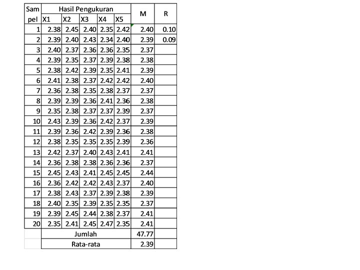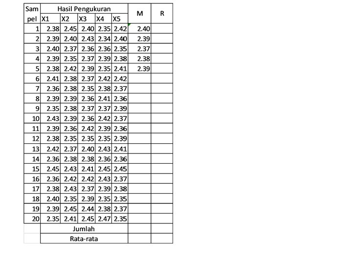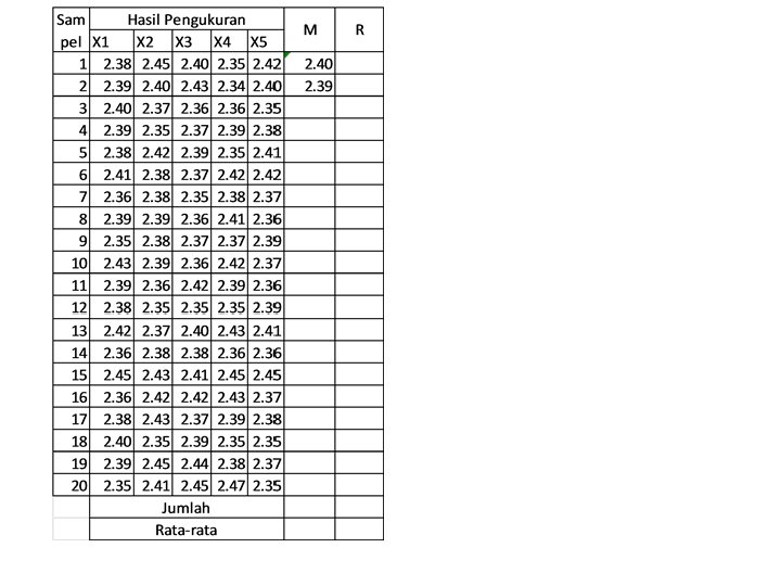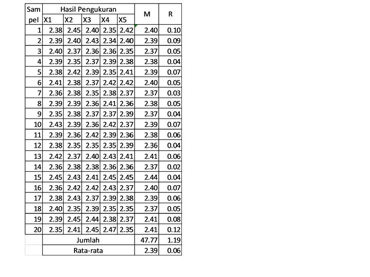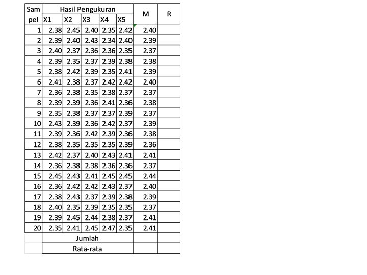 Contoh CV XYZ adalah perusahaan pembuat produk industri berupa barang. Ditetapkan spesifikasi adalah : 2. 40 ± 0, 05 mm. Untuk mengetahui kemampuan proses dan mengendalikan proses itu bagian pengendalian PT XYZ telah melakukan pengukuran terhadap 20 sampel subgroup. Masing-masing berukuran 5 unit (n=5). Diminta: • Tentukan nilai CL, UCL dan LCL untuk membuat X bar dan R Chart • Tentukan nilai CPk