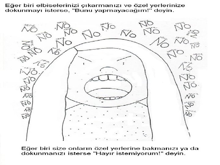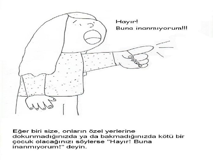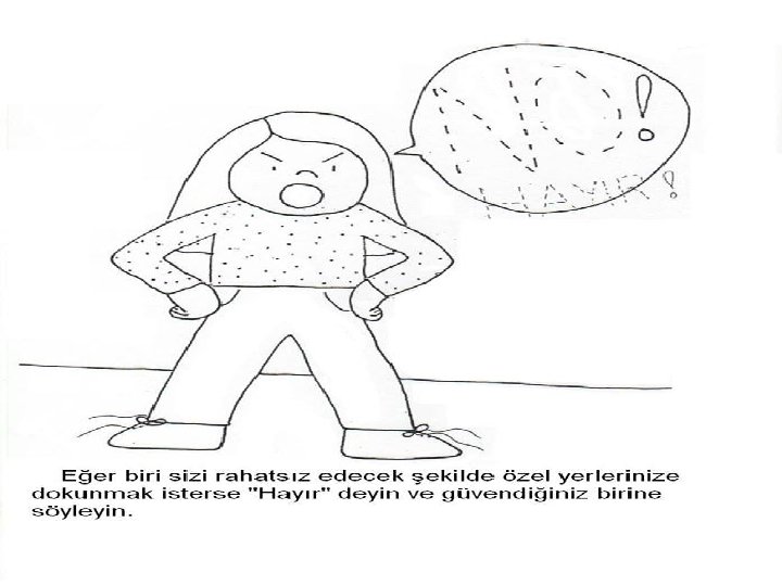 ’Hayır’ demek • Herhangi birisi sizi incitmeye kalkarsa onlara hayır diyebilirsiniz. • Bu tarz durumlarda o eylemi yapmaya çalışan yetişkinin sözüne itaat etmemeniz gerekmektedir.