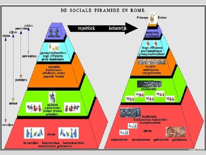 3000 1000 700 – De plebs – De equites (aristocratie) – De patriciërs (aristocratie) 1500 • In de samenleving kennen we drie grote – maar zeker niet homogene – klassen 2000 Samenleving 400 • Zie piramides (volgende sheet) 200 1 200 400