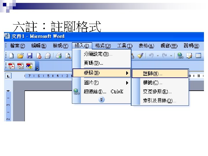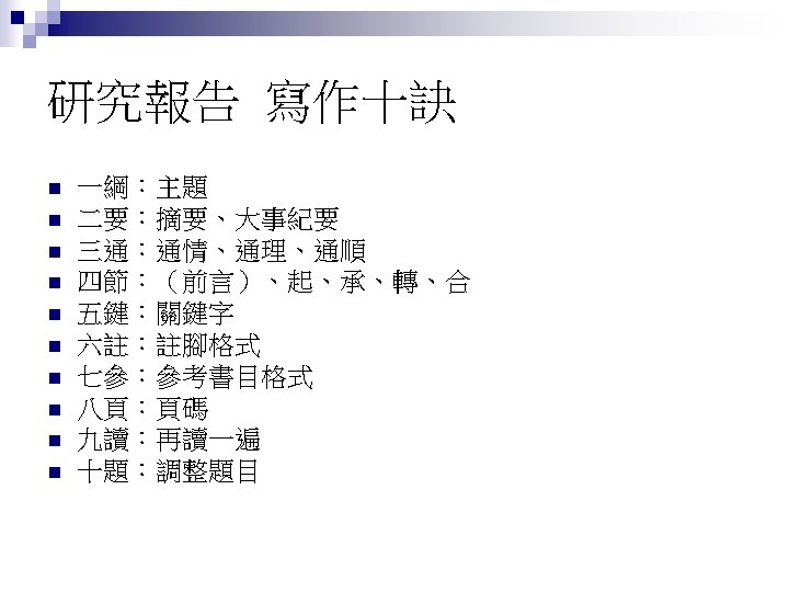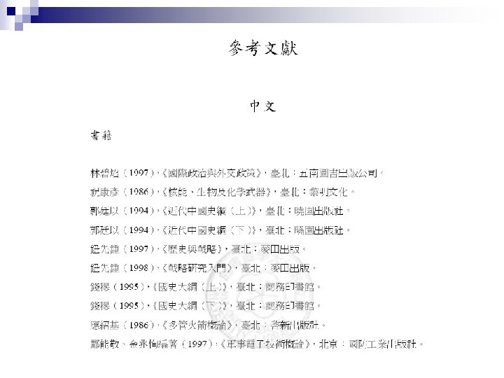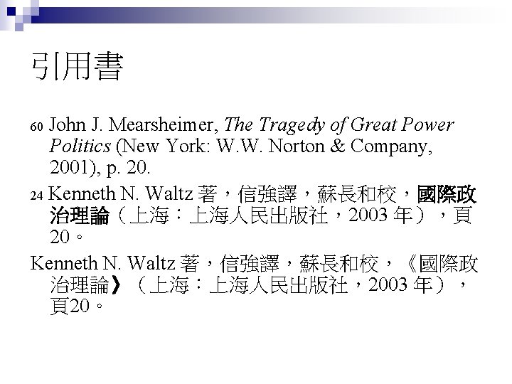 七參:參考書目格式 Keohane, Robert (1986), Neorealism and Its Critics, New York: Columbia University Press. n Keohane, Robert. (1986). Neorealism and Its Critics, New York: Columbia University Press. n 林碧炤(1997),《國際政治與外交政策 》,臺北:五南圖書出版公司。 n