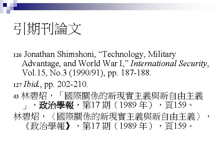 Shimshoni, Jonathan (1990/91), “Technology, Military Advantage, and World War I, ” International Security, 15: 3, 187 -215. n 鄭端耀(2005),「國際關係新古典現實 主義理論」,《問題與研究》,44: 1,115 -140。 n