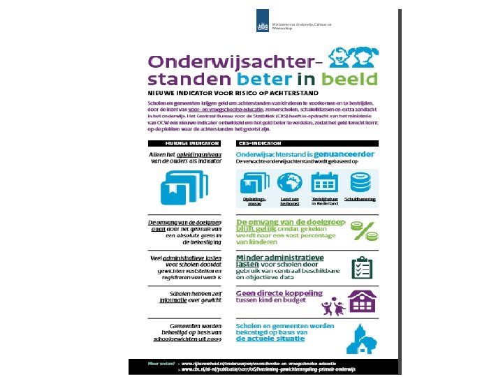 Interdepartementaal beleidsonderzoek ‘Onderwijsachterstandenbeleid, een duwtje in de rug? ’ Onderzoeksvragen: • In hoeverre is de huidige inzet tbv gelijkere kansen voor jongeren en het voorkomen en bestrijden van onderwijsachterstanden optimaal? • Op welke manieren kan de effectiviteit bij gelijke middelen vergroot worden? • Hoe kunnen publieke middelen doeltreffender en doelmatiger worden ingezet?