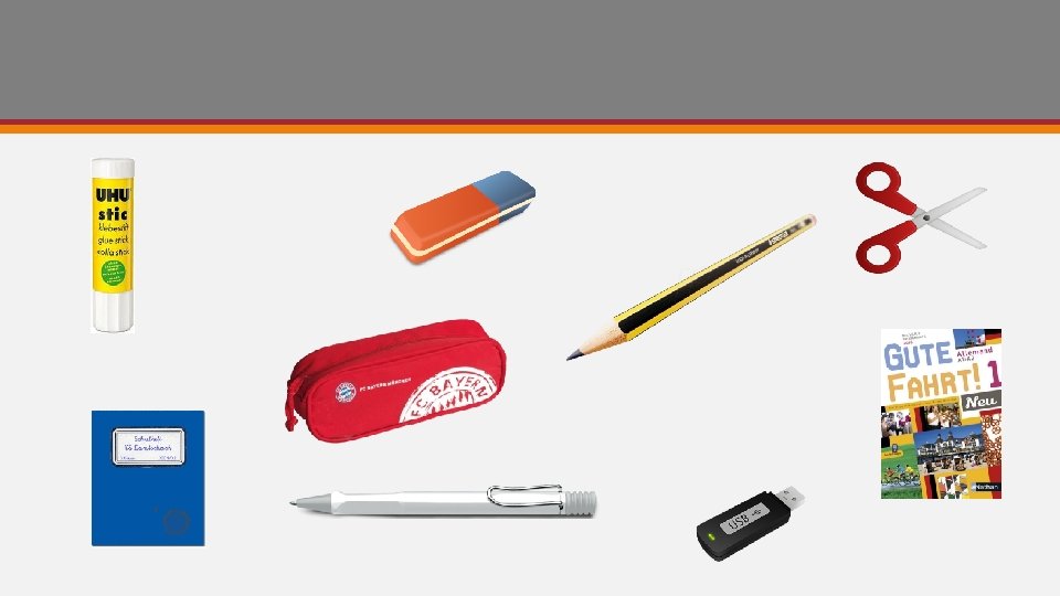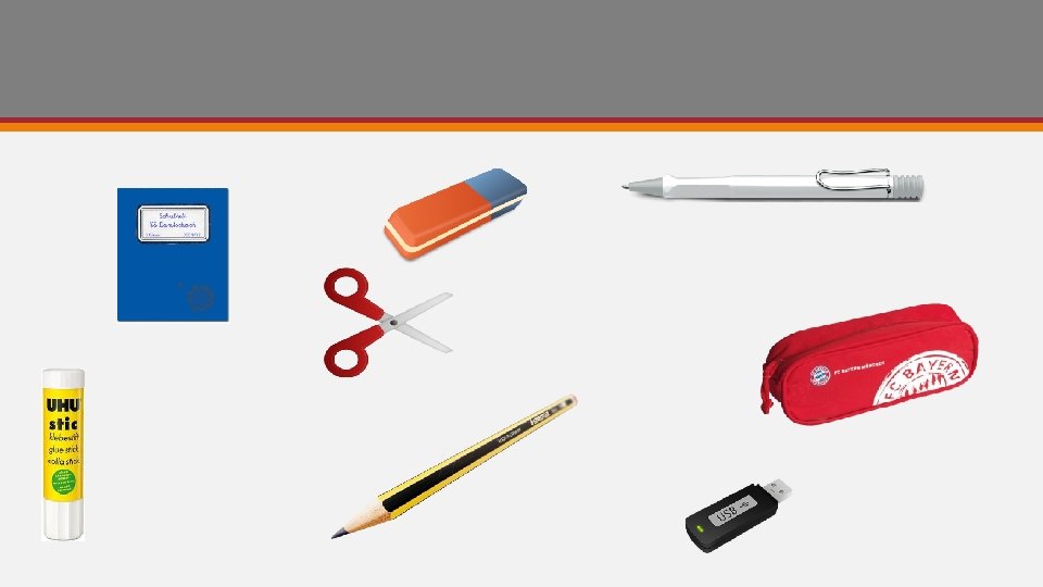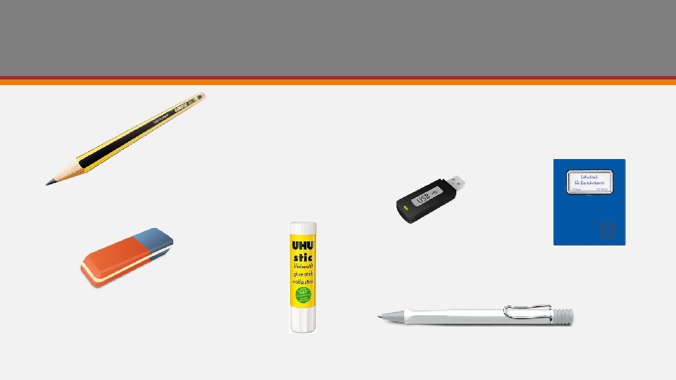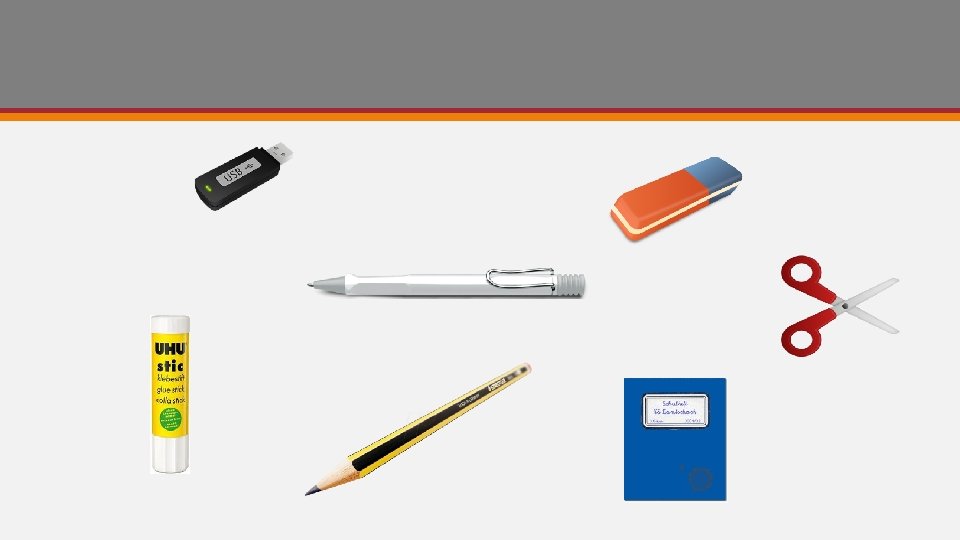 der Kuli das Lineal der Bleistift der Radiergummi das Buch das Heft die Schere das Mäppchen der Kleber der Marker der USB-Stick das Tablet