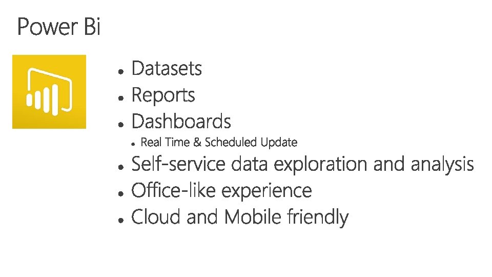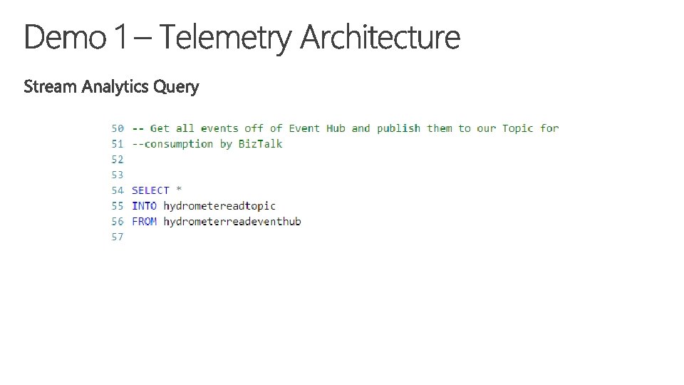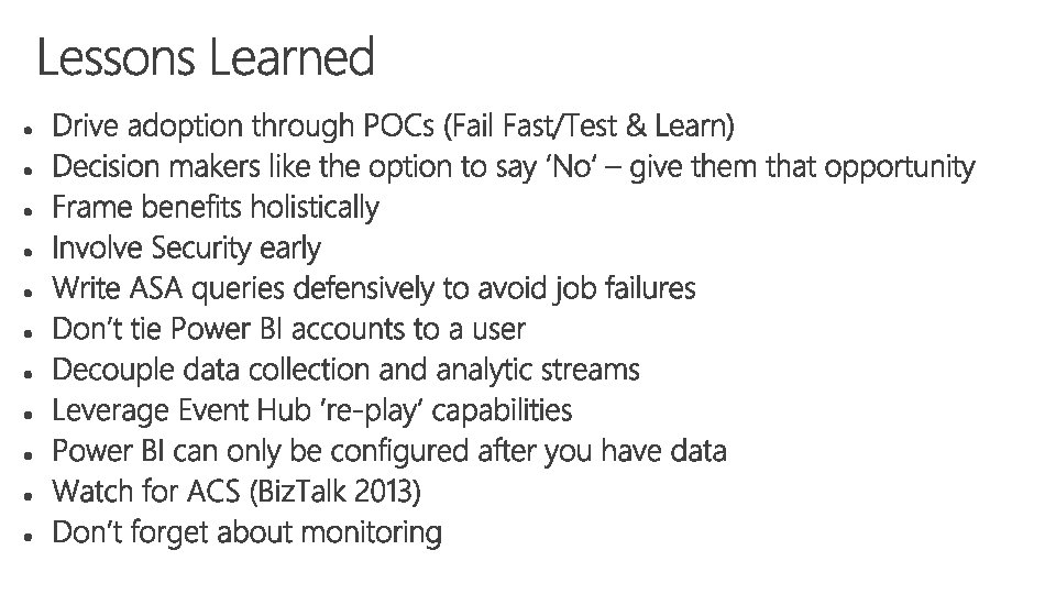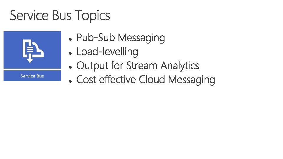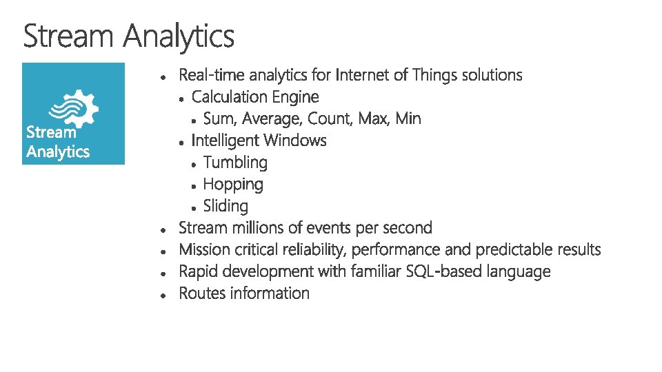 Devices Device Connectivity Storage Analytics Presentation & Action Event Hubs SQL Database Machine Learning App Service Bus Table/Blob Storage Stream Analytics Power BI External Data Sources Document. DB HDInsight Notification Hubs External Data Sources Data Factory Mobile Services { } Biz. Talk