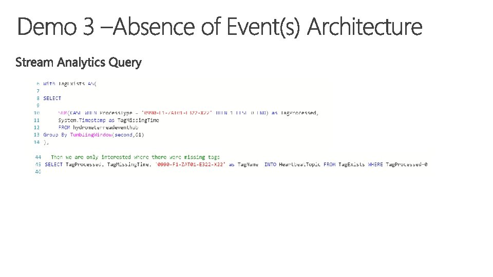 SELECT sensor. Id, COUNT(*) AS Count FROM Sensor. Readings TIMESTAMP BY time GROUP BY sensor. Id, Tumbling. Window(second, 10) SELECT sensor. Id, COUNT(*) AS Count, AVG(temp) FROM Sensor. Readings TIMESTAMP BY time GROUP BY sensor. Id, Hopping. Window(second, 10 , 5) SELECT sensor. Id, MIN(temp) as temp FROM Sensor. Readings TIMESTAMP BY time GROUP BY sensor. Id, Sliding. Window(second, 5) HAVING MIN(temp) > 75