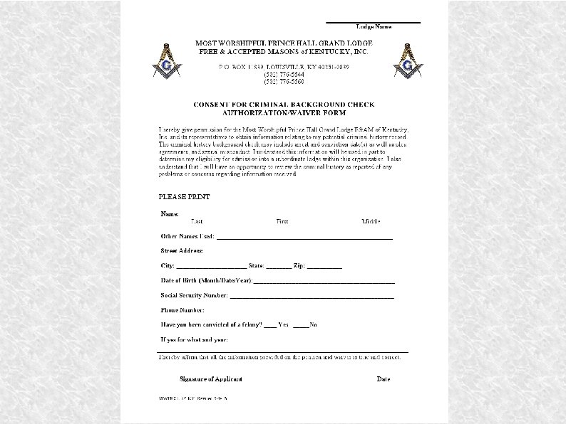 “Prince Hall Masons of Kentucky, Inc. ” 1. ) History of Prince Hall Masons of Kentucky, (41 - 42) 2. ) Make up of Membership, (43 -48) 3. ) Dues Cards, (49) 4. ) Dues and Fees, (50) 5. ) Dress Code, (51) 6. ) Prince Hall Petition, Investigation Report and Background Check, (52 -55) 7. ) Investigation process of a Candidate, (56) 8. ) Process of Membership Verification, (56) 9. ) Process of Recognition of a Prince Hall Visitor, (56)