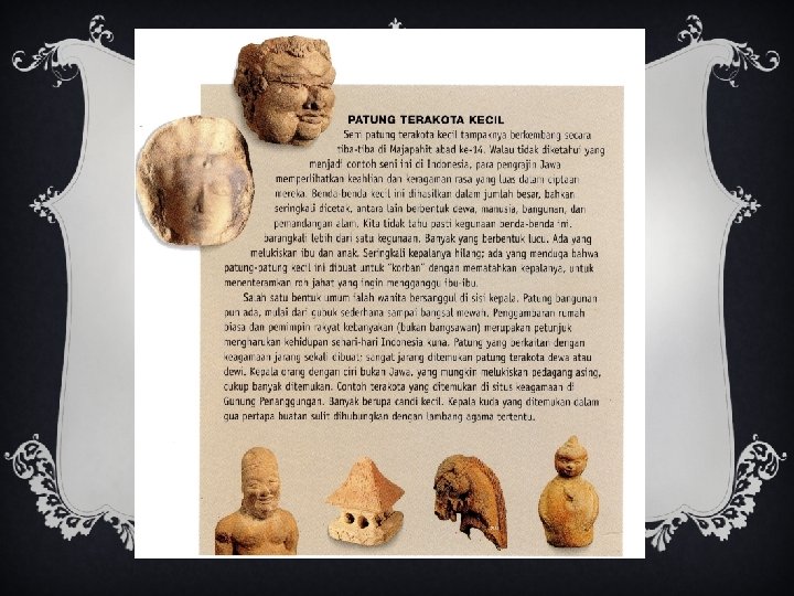 SUMBER SEJARAH v Prasasti Butak mengisahkan peristiwa keruntuhan Singosari dan perjuangan Raden Wijaya untuk mendirikan Majapahit. v Kidung Harsawijaya dan Kidung Panji Wijayakrama, mengisahkan perjuangan Raden Wijaya melawan Kediri dan tahun-tahun awal perkembangan Majapahit. v Kitab Pararaton, menceritakan pemerintahan Raja-Raja Singosari dan Majapahit. v Kitab Negarakertagama, menceritakan keadaan Majapahit terutama masa pemerintahan Hayam Wuruk. v Berbagai peninggalan Candi dan Reruntuhan Istana di Tro. Wulan.