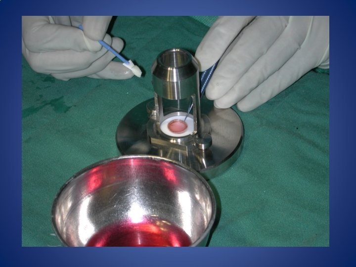 • Excision of donor cornea • It should always precede that of the host. Donor tissue is prepared by trephining a previously excised corneoscleral button, endothelial side up in a concave Teflon block • Alternatively, the donor may be trephined from the intact donor globe having first injected air or viscoelastic substance into the anterior chamber • The donor button is usually about 0. 25 mm larger in diameter than the planned diameter of the host opening, to facilitate watertight closure, minimize postoperative flattening and reduce the possibility of postoperative glaucoma