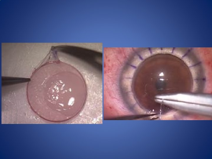 Penetrating keratoplasty • Indications • Optical keratoplasty is performed to improve vision • • Bullous keratopathy Keratoconus Dystrophies & degenerations Scarring • Tectonic grafting may be carried out to restore or preserve corneal integrity in eyes with severe structural changes such as • Stromal thinning • Descemetocele