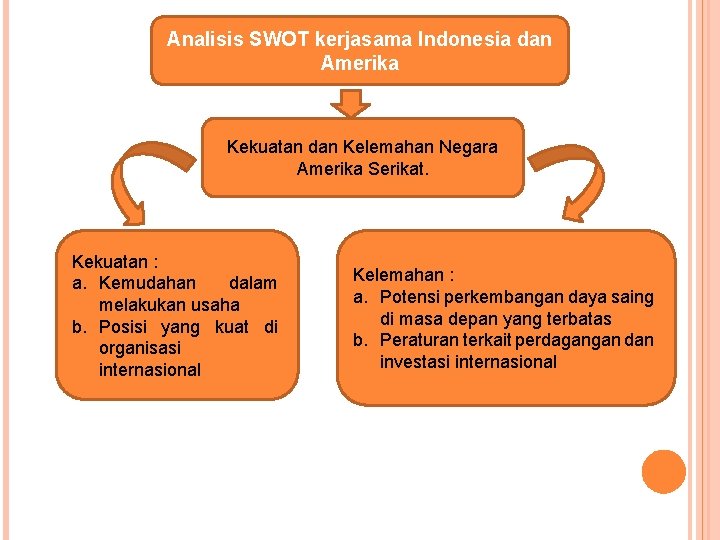 Analisis SWOT kerjasama Indonesia dan Amerika Kekuatan dan Kelemahan Negara Amerika Serikat. Kekuatan : a. Kemudahan dalam melakukan usaha b. Posisi yang kuat di organisasi internasional Kelemahan : a. Potensi perkembangan daya saing di masa depan yang terbatas b. Peraturan terkait perdagangan dan investasi internasional