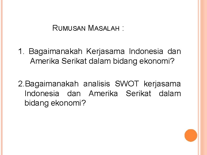 RUMUSAN MASALAH : 1. Bagaimanakah Kerjasama Indonesia dan Amerika Serikat dalam bidang ekonomi? 2. Bagaimanakah analisis SWOT kerjasama Indonesia dan Amerika Serikat dalam bidang ekonomi?