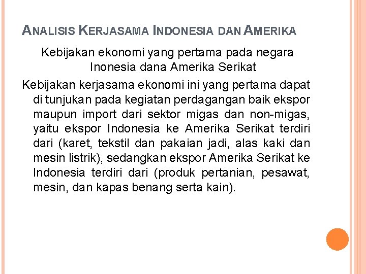 ANALISIS KERJASAMA INDONESIA DAN AMERIKA Kebijakan ekonomi yang pertama pada negara Inonesia dana Amerika Serikat Kebijakan kerjasama ekonomi ini yang pertama dapat di tunjukan pada kegiatan perdagangan baik ekspor maupun import dari sektor migas dan non-migas, yaitu ekspor Indonesia ke Amerika Serikat terdiri dari (karet, tekstil dan pakaian jadi, alas kaki dan mesin listrik), sedangkan ekspor Amerika Serikat ke Indonesia terdiri dari (produk pertanian, pesawat, mesin, dan kapas benang serta kain).