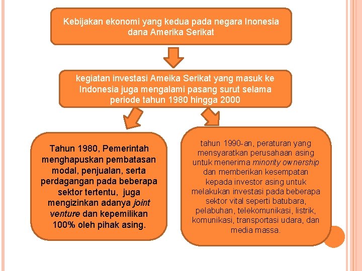 Kebijakan ekonomi yang kedua pada negara Inonesia dana Amerika Serikat kegiatan investasi Ameika Serikat yang masuk ke Indonesia juga mengalami pasang surut selama periode tahun 1980 hingga 2000 Tahun 1980, Pemerintah menghapuskan pembatasan modal, penjualan, serta perdagangan pada beberapa sektor tertentu, juga mengizinkan adanya joint venture dan kepemilikan 100% oleh pihak asing. tahun 1990 -an, peraturan yang mensyaratkan perusahaan asing untuk menerima minority ownership dan memberikan kesempatan kepada investor asing untuk melakukan investasi pada beberapa sektor vital seperti batubara, pelabuhan, telekomunikasi, listrik, komunikasi, transportasi udara, dan media massa.