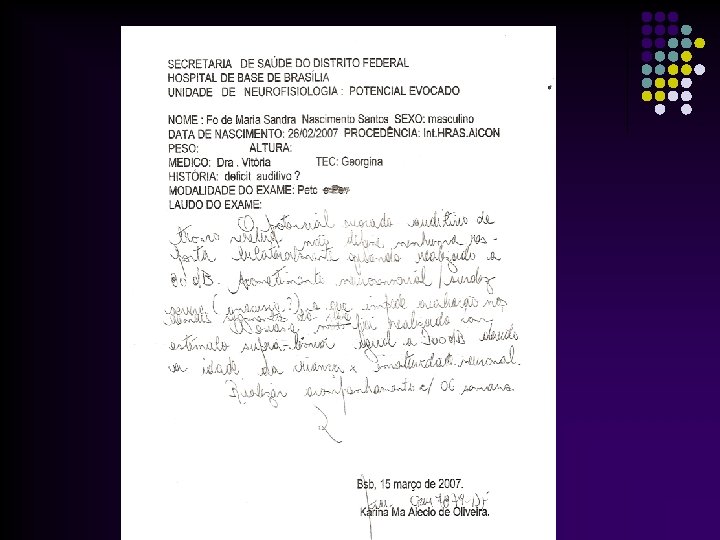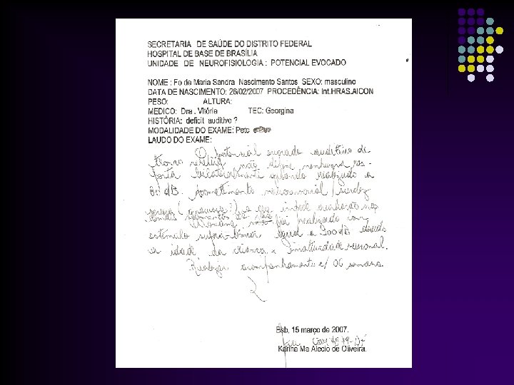 Caso Clínico Teste da Orelhinha(Triagem auditiva)= normal Estuda a capacidade da cóclea em transmitir sons para o conduto auditivo externo. l BERA (Audiometria de respostas elétricas do tronco cerebral): Analisa a ativação do VIII PAR e as estruturas auditivas do tronco cerebral. l Resultado: Provável Acusia severa; repetir em semanas l