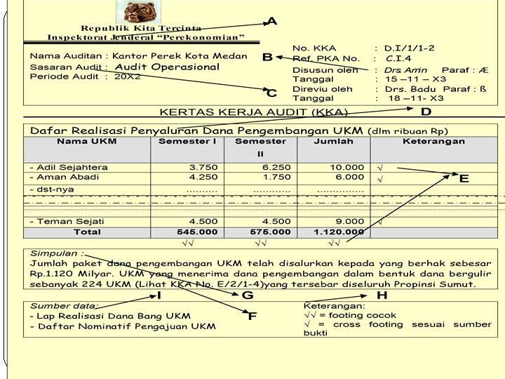 Dokumentasi (Cont. ) Penulisan harus sederhana dan mudah dipahami oleh pembaca awan. Ditata secara logis sesuai dengan program audit. Setiap kertas kerja umum ada keterangan judul; referensi keg. audit; tick marks; tanggal penyusunan dan paraf auditor; serta nomor referensi kertas kerja; sumber data.