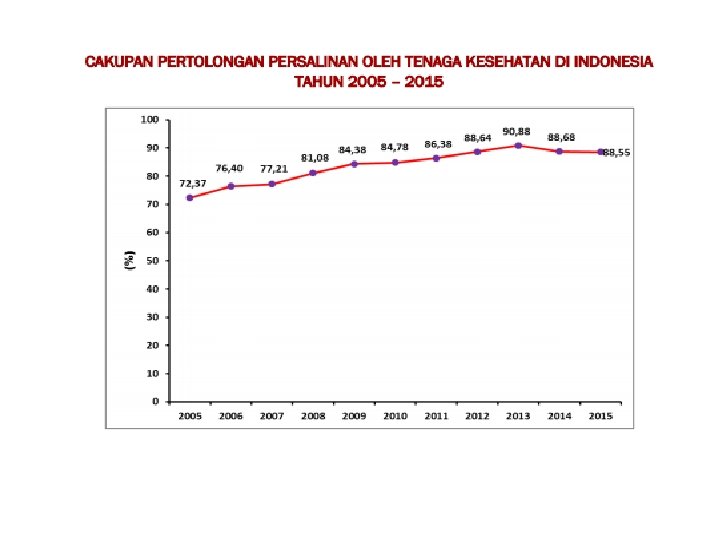 3. pelayanan kesehatan ibu bersalin � mendorong agar setiap persalinan ditolong oleh tenaga kesehatan terlatih yaitu dokter spesialis kebidanan dan kandungan (Sp. OG), dokter umum, dan bidan, serta diupayakan dilakukan di fasilitas pelayanan kesehatan. � Pertolongan persalinan adalah proses pelayanan persalinan yang dimulai pada kala I sampai dengan kala IV persalinan. � Keberhasilan program ini diukur melalui indikator persentase persalinan ditolong tenaga kesehatan terlatih (Cakupan PN) dan persentase persalinan di fasilitas pelayanan kesehatan (cakupan PF)