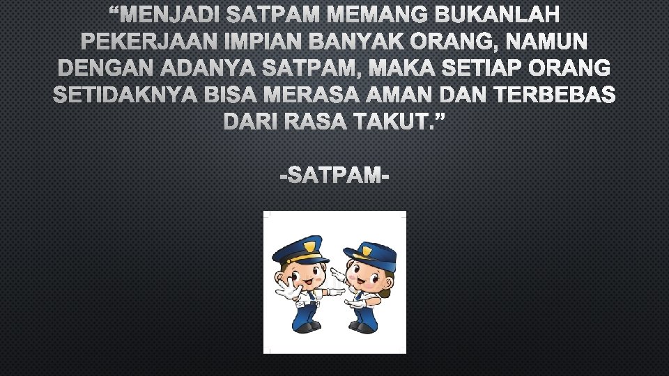 PERANAN SATPAM TERUS BERTAMBAH……… Physical Security q Meningkatkan aspek keamanan (physical security) q Disituasi normal: keamanan hanya fokus pada keamanan fisik, ancaman kriminalitas, terorisme, dan ancaman lainnya. q Disituasi normal: personel harus menjaga akses publik dan akses terbatas hingga melakukan pemeriksaan terhadap lingkungan kerja dan memastikan tidak ada sesuatu yang berbahaya serta melakukan profiling untuk menemukan ancaman. Bio Security q Semua tindakan yang merupakan pertahanan pertama untuk pengendalian wabah dan dilakukan untuk mencegah semua kemungkinan penularan/kontak sehingga rantai penyebaran penyakit dapat diminimalkan. q Bio-Security protokol Covid-19 seperti adanya jaga jarak (Physical Distancing), pengawasan terhadap kesehatan (Health Screening), menyediakan fasilitas yang dapat berjalan tanpa sentuhan (Touchless Processing), memastikan kebersihan (Cleanliness & Sanitizing), memastikan kesehatan karyawan (People Protection). Cyber Security q Harus memahami integrasi berbagai sistem keamanan. q SATPAM adalah user dalam teknologi q SATPAM harus mempunyai kemampuan dan pemahaman dalam penggunaan peralatan teknolgi yang menunjang keamaanan misalnya CCTV, alarm system, access control, penggunaan aplikasi, bagaimana merespon kejadian darurat, penggunaan alat pengecekan suhu sesuai protokol COVID-19, dll. q SATPAM tidak boleh “Gagap Teknologi”